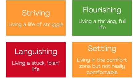 Some of us start to question if we made the right choice. We question retirement in general. We hold onto the need to fill every hour with something urgent. We are so uncomfortable with this new lifestyle that we think of looking for a new job. It can be a surprising response to a time in life we have looked forward to and planned for over the years. The transition that we thought would put us into the Positive Psychology “Flourishing” box, has us bouncing between “striving” to find our new normal, “settling” for less than what we dreamed of, and at times, down into that “languishing” box as we struggle to find ways to productively use our free time.